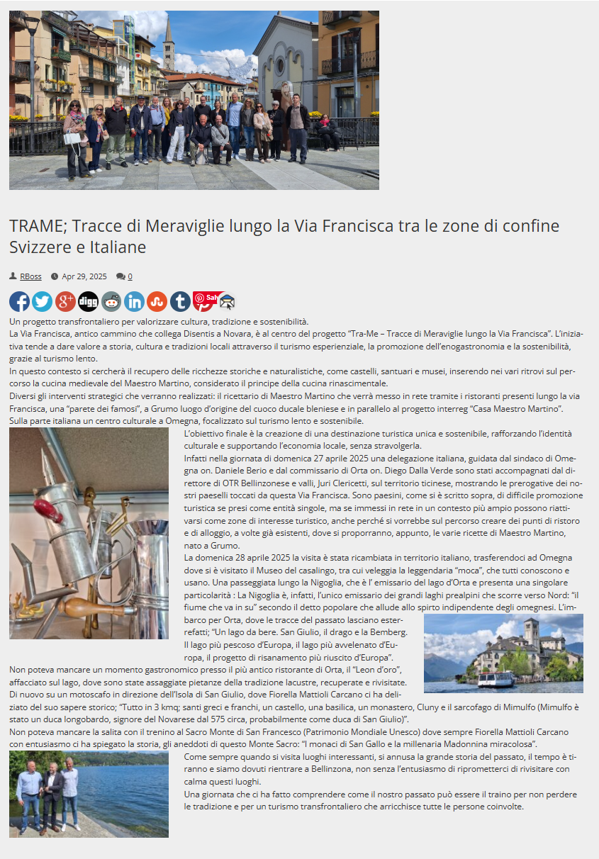 Un viaggio tra natura, castelli, antiche ricette e tradizioni. TRA-ME riscopre le meraviglie lungo la Via Francisca, da Disentis a Novara, attraverso esperienze culturali e gastronomiche legate alla figura di Maestro Martino, cuoco bleniese simbolo della cucina medievale. Il progetto promuove un turismo lento e sostenibile, rafforza i legami tra territori e crea nuove infrastrutture culturali, come la Casa Maestro Martino in Valle di Blenio e un centro multimediale a Omegna. L’Organizzazione Turistica Regionale Bellinzonese e Alto Ticino è capofila svizzera dell’iniziativa e guida il progetto insieme ai partner Associazione Amici della Via Francisca del Lucomagno, Blenio Bellissima e il gruppo storico Spada nella Rocca. Capofila italiano è il Comune di Omegna.